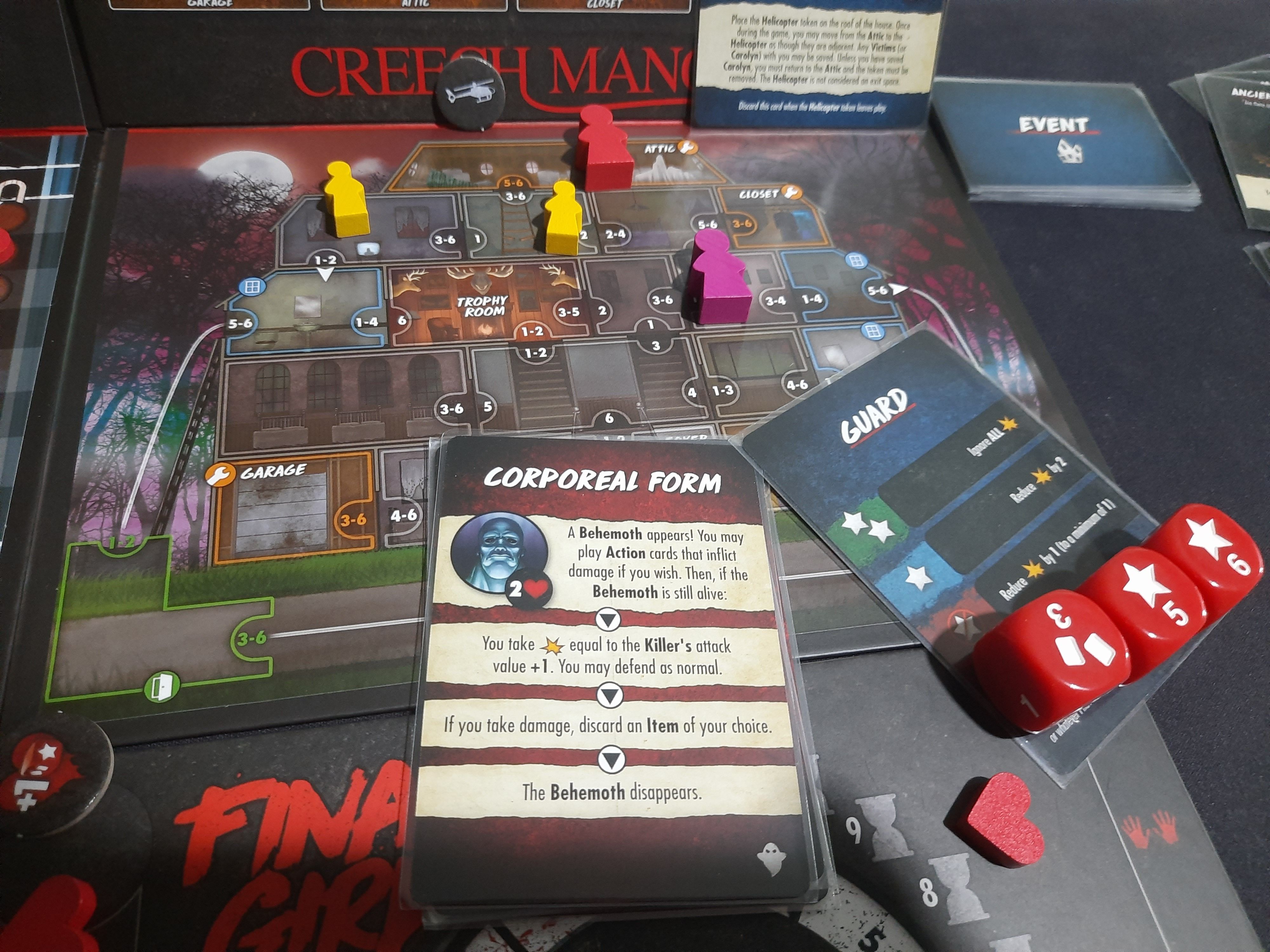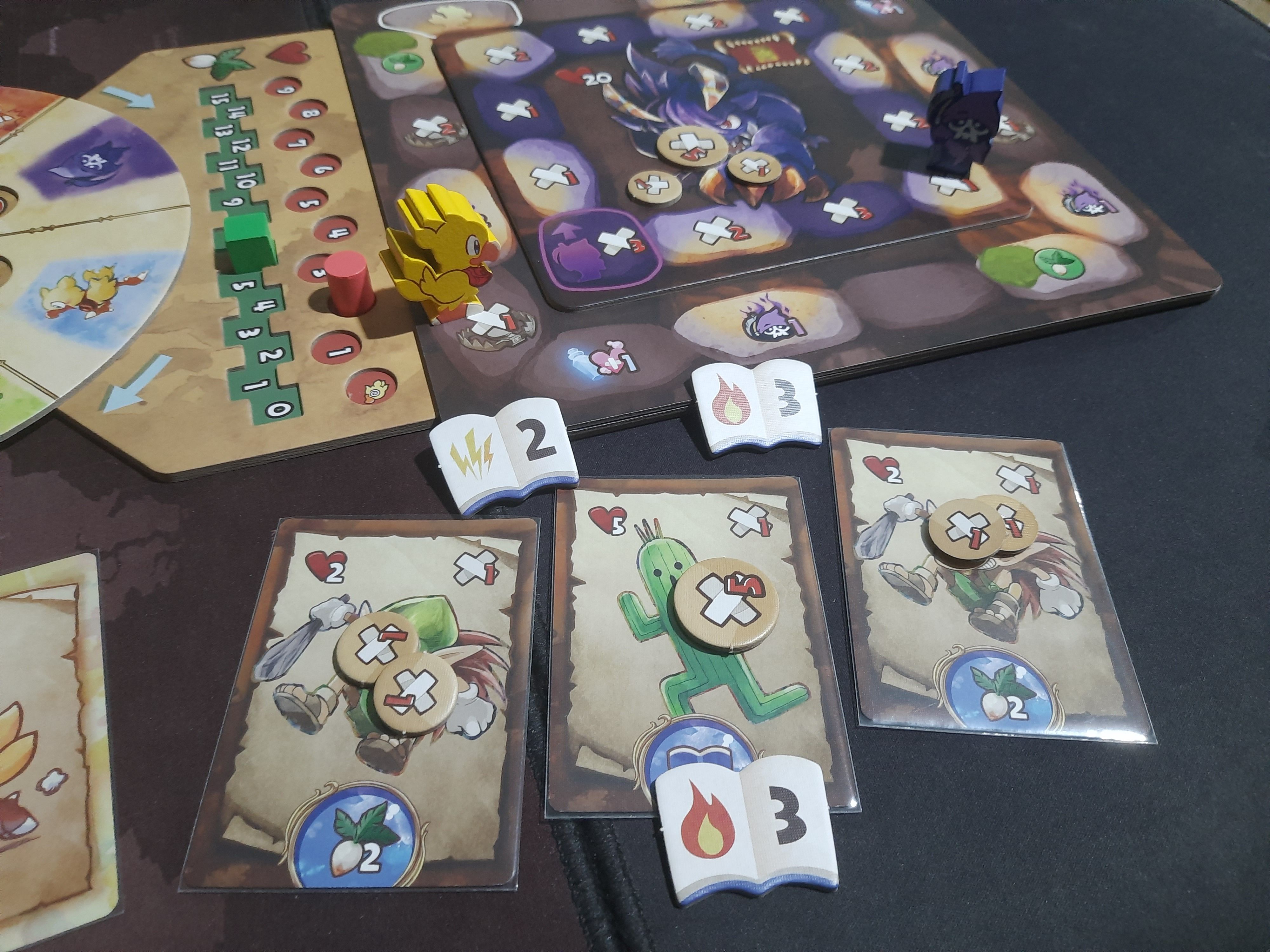 During the game, you have to collect foods and spell books, maintaining Chocobo’s health and also manage the supply of your hand of cards. On the first 3 floors, there is a timer but not restricted, tracked using the Reaper Meeple on their Reaper track.