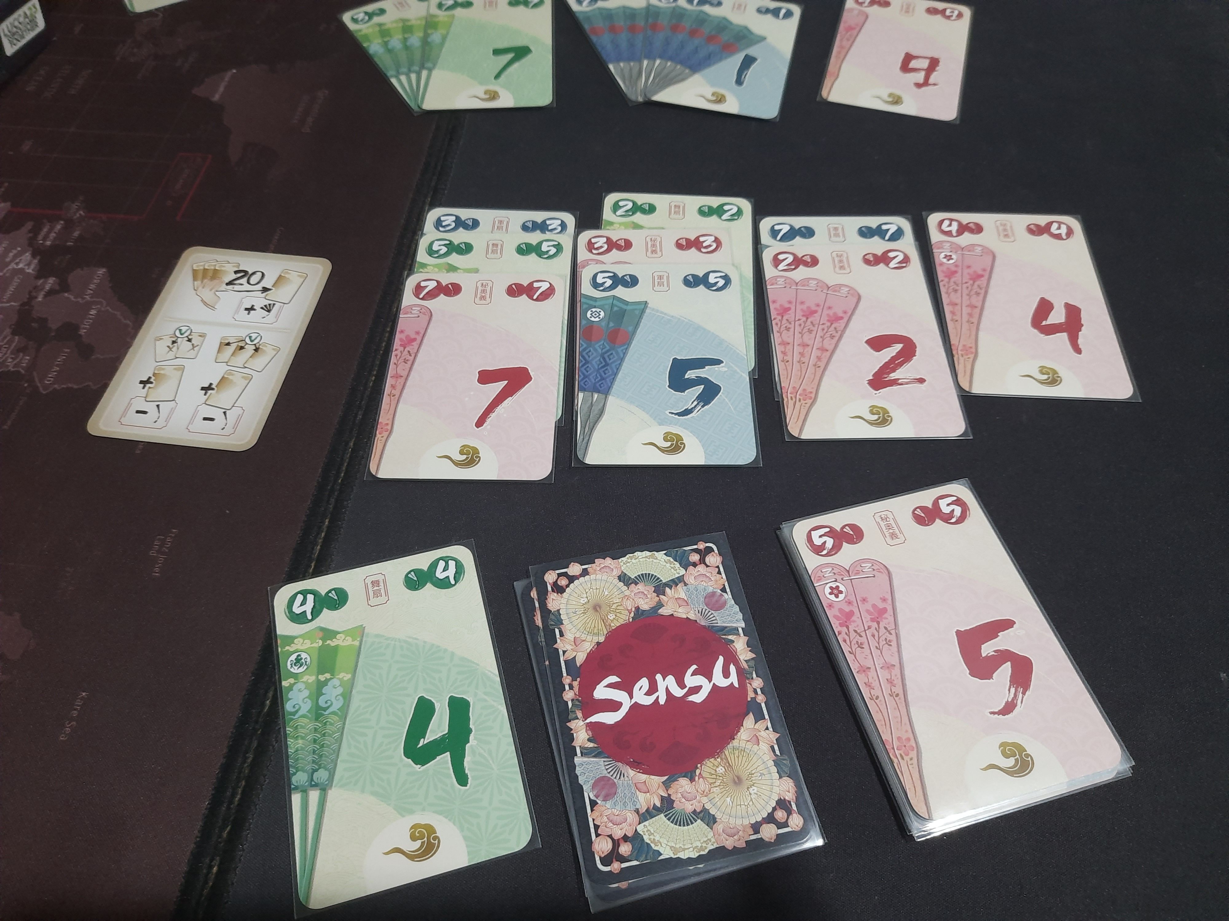In the solo mode of Sensu, you play only with a deck of 27 cards, 1 to 9 of the 3 colors. You still try to reach the value combination of 20 and build 3 fans each with 10 sticks. It is a BYOS where you score based on the number of sticks you have built. If you can finish all 3 before the deck runs out, then you get to add the remaining cards as you score.