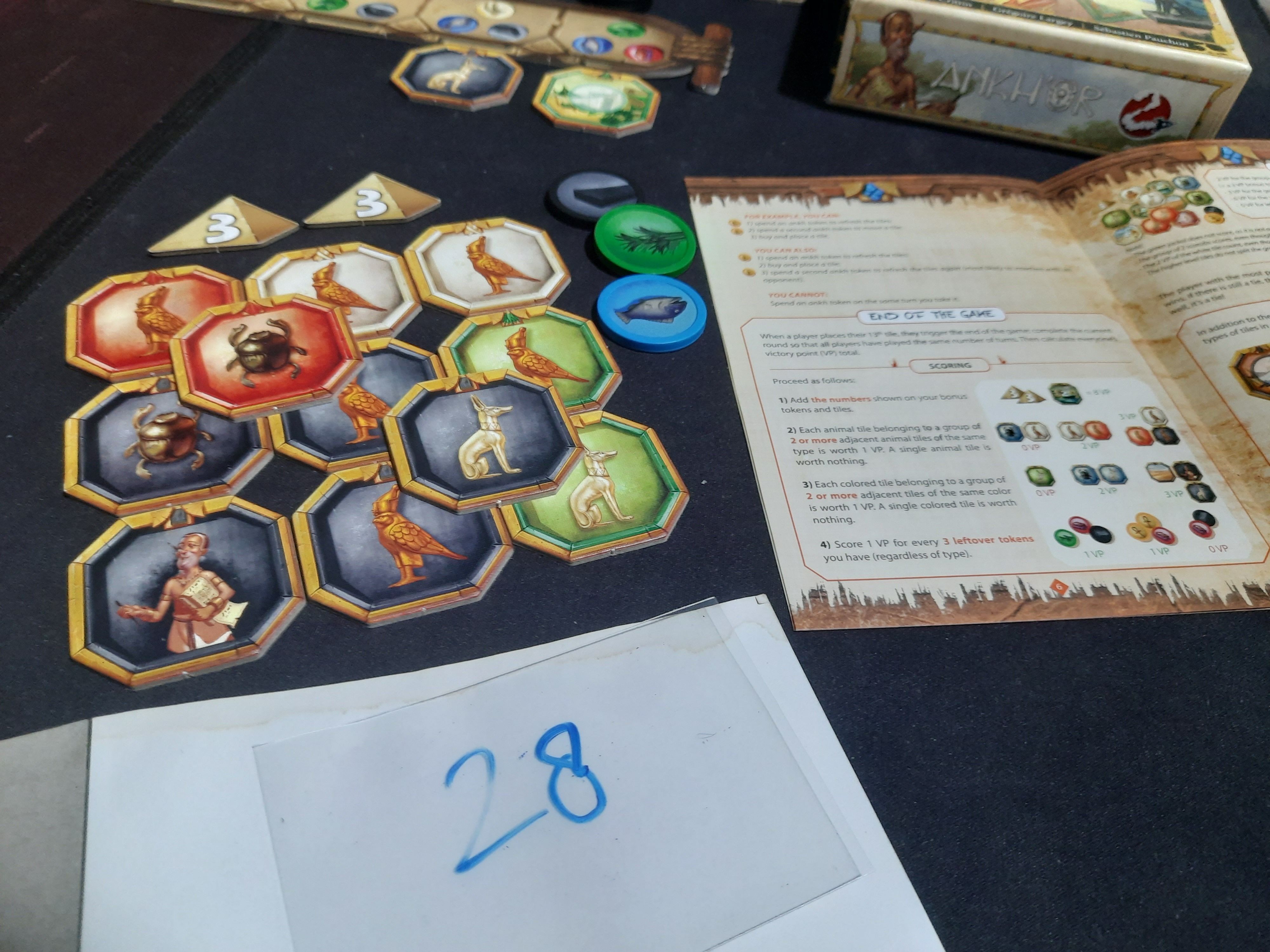 SCORING. 1st player got 6 points from bonus tokens, 6 from the tiles of Value 2, 1 from 3 leftover tokens, 3 from Green tiles, 5 from Blue, 5 from White, 2 from Beetle. So their final score was 28. I forgot to calculate their 2nd group of 5.