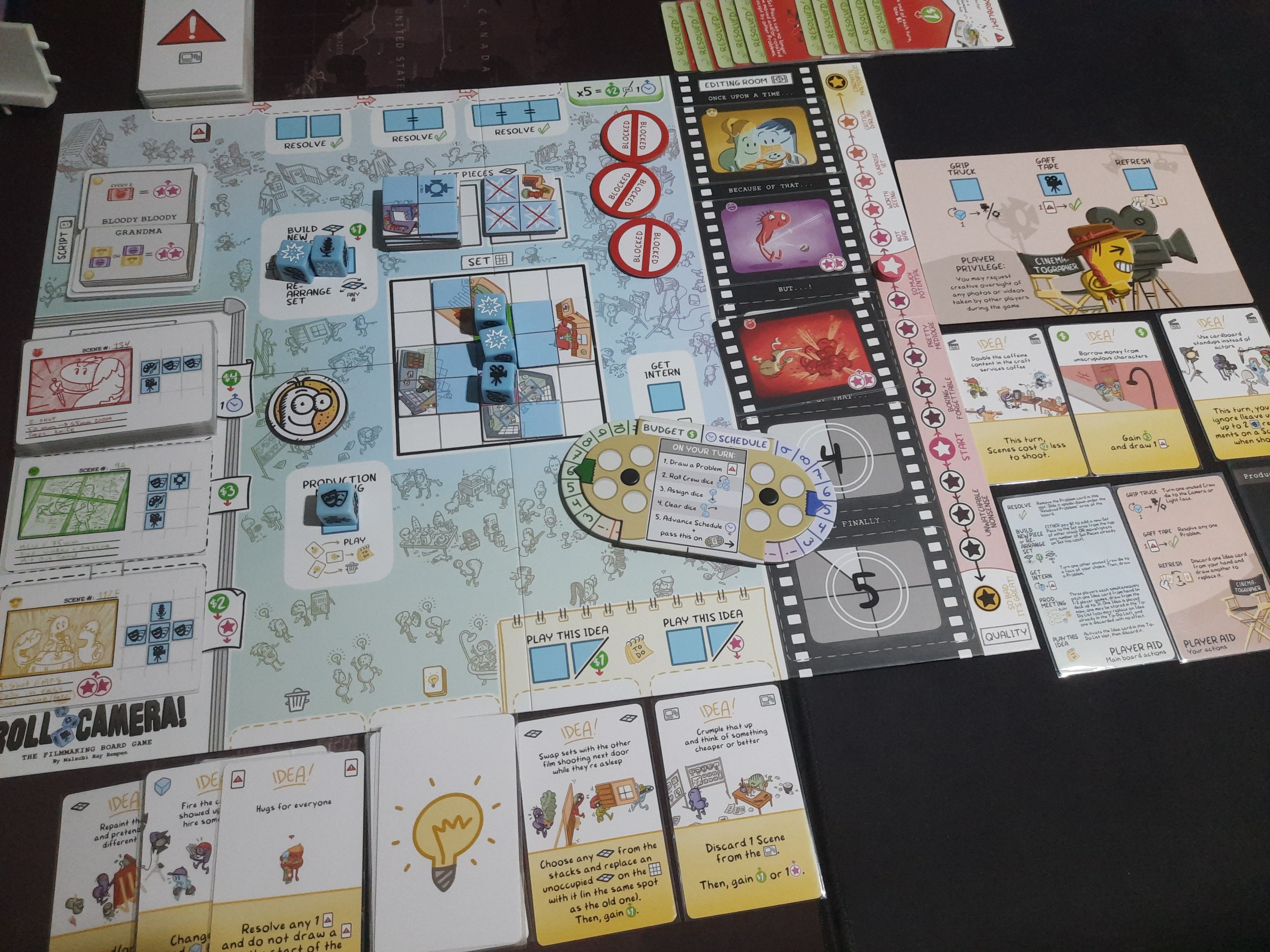 Played as the Cinematographer with the power to turn any dice into either camera or lighting. The 2nd power allows me to solve an issue using just 1 camera crew. Starting script was BLOODY BLOODY GRANDMA. Every 2 red scenes will increase the quality by 2 and every combination of purple and yellow scene, adjacent in any order gives you 2 quality.