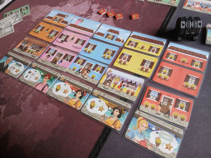 Everytime we complete a house we will get a visit from one of them by taking their card and put them as part of our tableau. They will define the score we will get at the end of the game and if we have as many objects that the characters like, we can score higher.